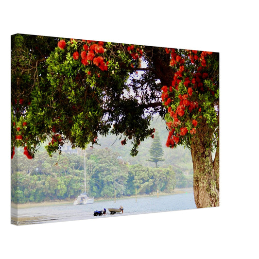 Mangawhai Heads Estuary Boats Under Pohutukawa Canvas